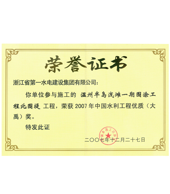 中國水利工程優(yōu)質(zhì)(大禹)獎(jiǎng)——溫州半島淺灘一期圍涂工程北圍堤工程(2007)