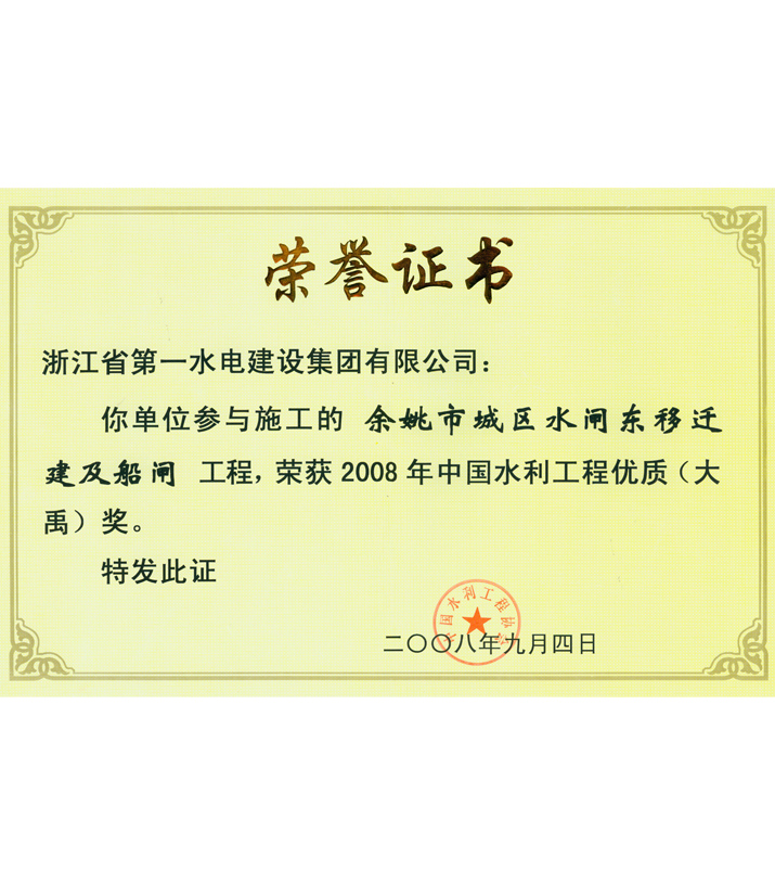 中國水利工程優(yōu)質(zhì)(大禹)獎(jiǎng)——余姚市城區(qū)水閘東移遷建及船閘工程(2008)