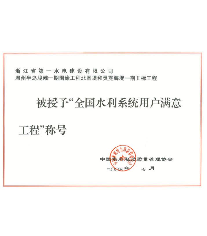 全國水利系統(tǒng)用戶滿意工程——溫州半島淺灘一期圍涂工程北圍堤和靈霓海堤一期Ⅱ標(biāo)工程