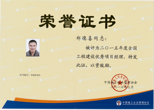 鄭德喜——2015年度全國(guó)工程建設(shè)優(yōu)秀項(xiàng)目經(jīng)理