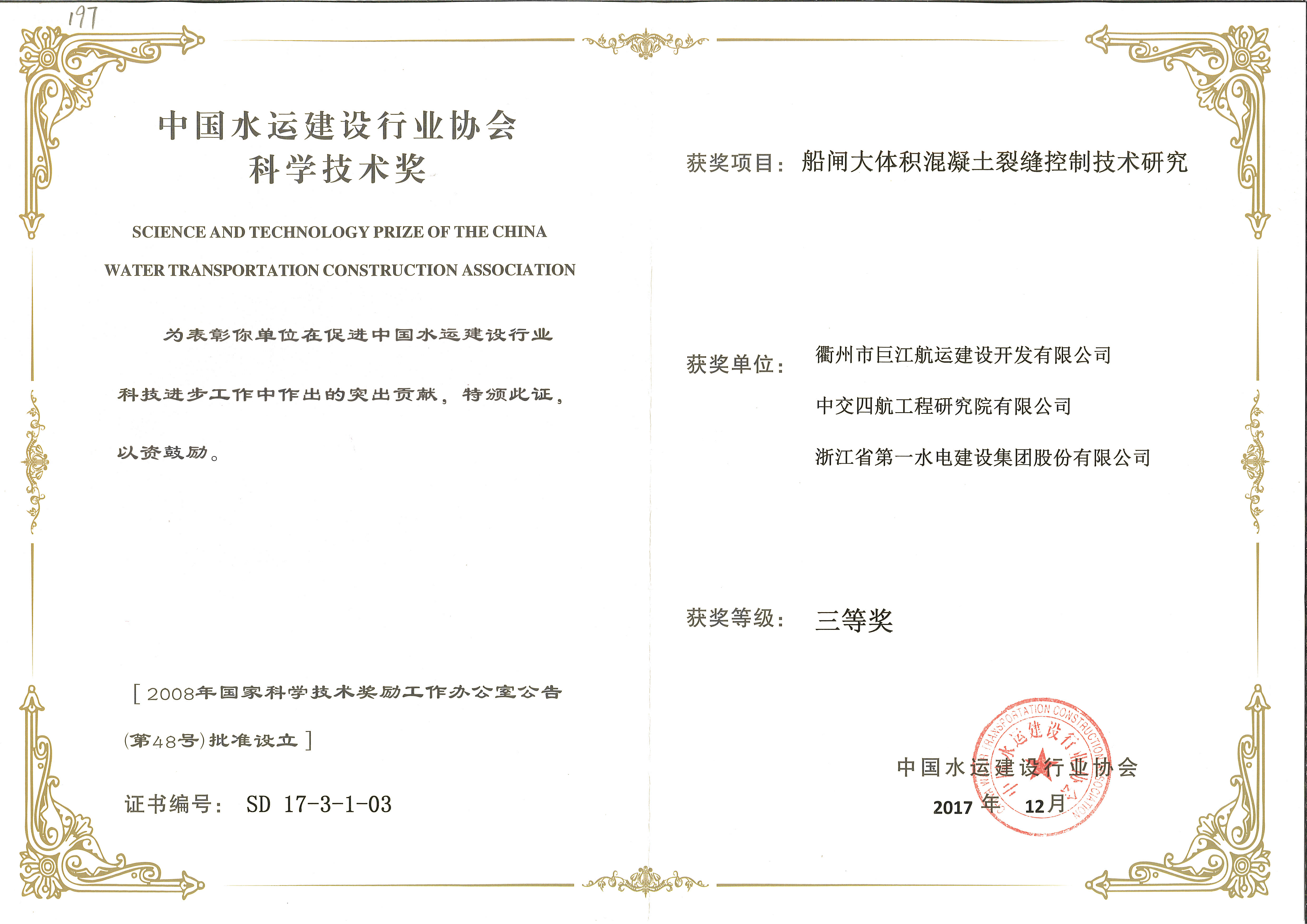 中國水運(yùn)建設(shè)行業(yè)協(xié)會(huì)科學(xué)進(jìn)步獎(jiǎng)三等獎(jiǎng)——船閘大體積混凝土裂縫控制技術(shù)研究