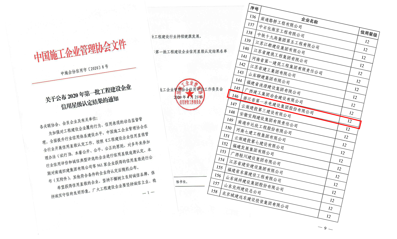 近期,中國施工企業(yè)管理協(xié)會發(fā)布2020年第一批工程建設(shè)企業(yè)信用星級認(rèn)定結(jié)果名單,在961家企業(yè)中,集團(tuán)公司以良好的企業(yè)信譽(yù)獲得累計(jì)信用星級12星。