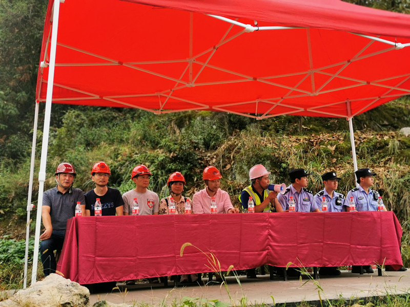 潛明水庫引水工程二標的首次爆破日,同時也是縉云一年一度的傳統(tǒng)非物質(zhì)文化遺產(chǎn)活動“迎岸”開展的日子?;顒拥攸c就在項目部周升塘工區(qū)不遠處的山上,附近聚集了近5000余人,而項目部圍欄警戒的這條路正好是通往“迎岸”的唯一道路,車來車往使得警戒難度大大增加。在當?shù)卣块T大力支持下爆破警戒有序進行。
