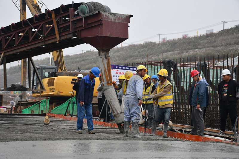 “準(zhǔn)備了這么久,第一倉底板的澆筑終于要在我們計(jì)劃的時(shí)間開始了!”一位頭戴安全帽,衣服上沾滿著泥土的現(xiàn)場工人激動(dòng)地說道。中午12點(diǎn)半,混凝土罐車準(zhǔn)時(shí)到達(dá)施工現(xiàn)場。在一系列澆筑前的檢測工作完成后,“轟隆隆”的機(jī)械聲響起。