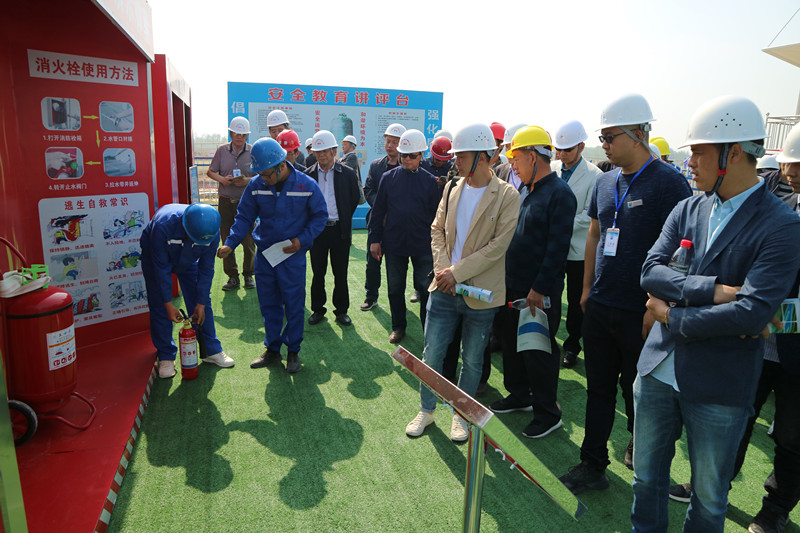 下午14點30分,觀摩團(tuán)集合列隊完畢后,水利局副局長王旭光首先致詞。隨后,代表們走上觀禮臺,在仿真沙盤前認(rèn)真聽取了工程簡況和工程進(jìn)展情況講解。來到安全體驗區(qū),代表們身臨其境,仔細(xì)體味,感受頗深。在工程建設(shè)創(chuàng)優(yōu)目標(biāo)展板前,各位代表駐足良久,深深為創(chuàng)優(yōu)目標(biāo)“確保大禹獎,爭創(chuàng)魯班獎”建設(shè)者們的雄心壯志所鼓舞。順著沿途的宣傳展板,大家還參觀了永久拌合站和現(xiàn)場試驗室。觀摩代表們邊走邊談,對工地標(biāo)化建設(shè)工作嘖嘖稱贊。