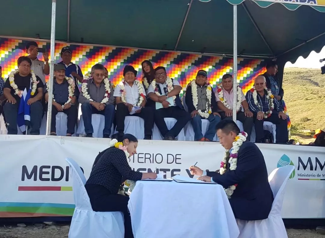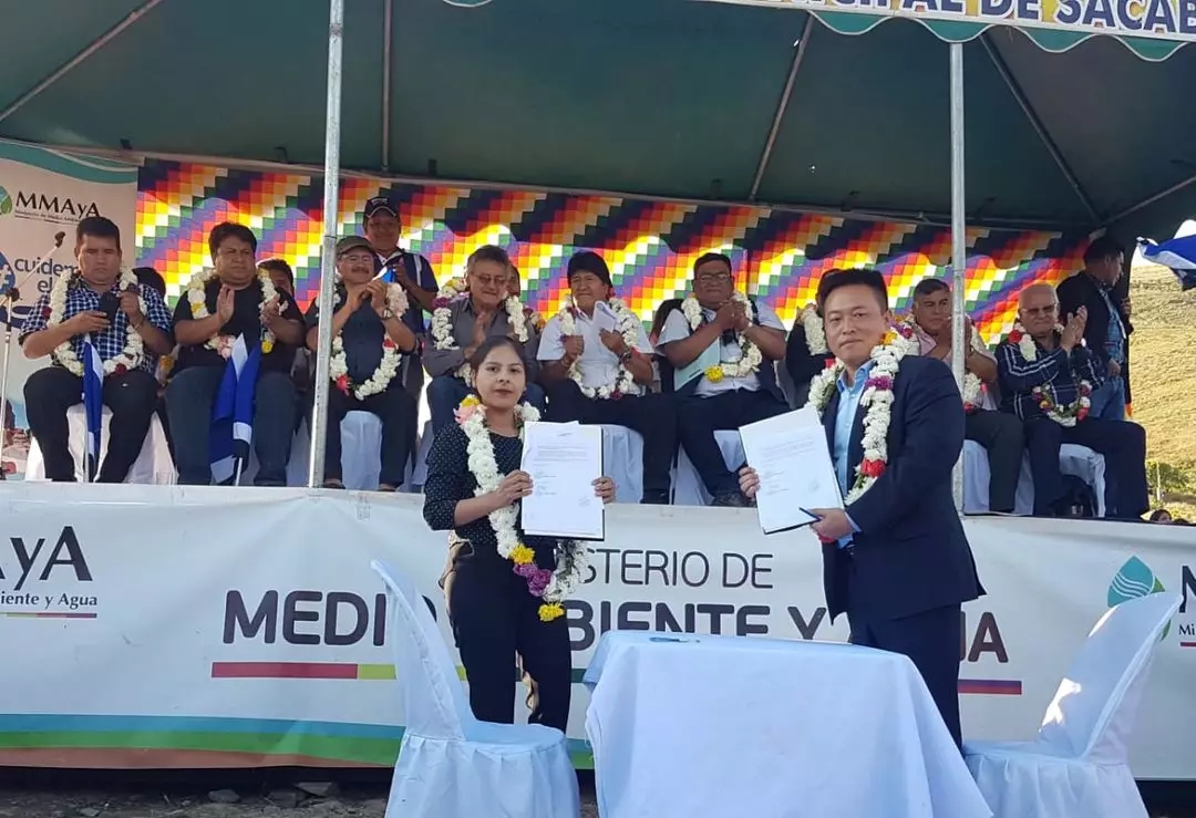 當(dāng)?shù)貢r(shí)間2019年4月13日下午,在玻利維亞總統(tǒng)莫拉萊斯見(jiàn)證下,公司與玻利維亞水資源與環(huán)境部UCP正式簽署了科恰班巴一號(hào)飲水線項(xiàng)目合同。簽約儀式在項(xiàng)目五號(hào)儲(chǔ)水罐建設(shè)現(xiàn)場(chǎng)舉行。本項(xiàng)目也是公司繼承建科維哈飲用水系統(tǒng)建設(shè)與污水管網(wǎng)改善項(xiàng)目之后,與UCP合作的第二個(gè)項(xiàng)目。玻利維亞水資源與環(huán)境部部長(zhǎng)、科恰班巴省長(zhǎng)、科恰班巴市長(zhǎng)、薩卡瓦市長(zhǎng)、蒂基帕亞市長(zhǎng)、法國(guó)開(kāi)發(fā)署(AFD)駐玻利維亞專員、UCP總協(xié)調(diào)員、科恰班巴供水公司總裁等人員參加了簽約儀式。